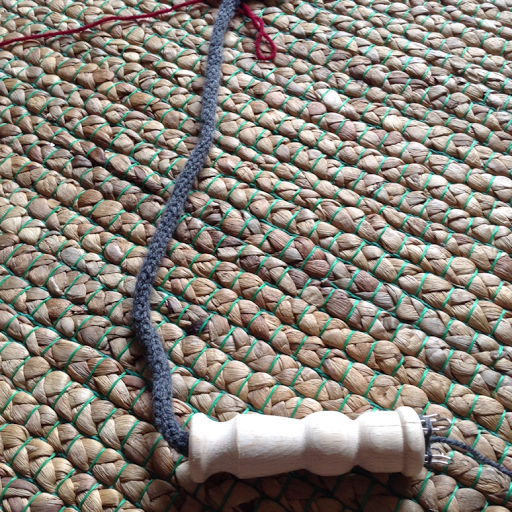 In der einen Ecke findet sich die Strickliesel, bei der ich zwischendrin immer wieder die Wolle wechsele, damit der Teppich auch etwas bunt wird!
